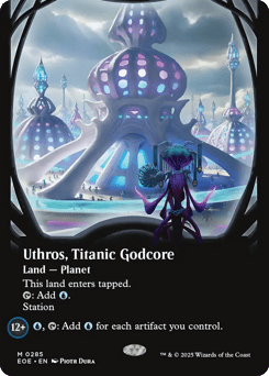 This land enters tapped. {T}: Add {U}. Station (Tap another creature you control: Put charge counters equal to its power on this Planet. Station only as a sorcery.) Station 12+: {U}, {T}: Add {U} for each artifact you control.