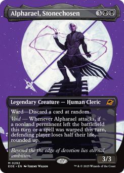 Ward—Discard a card at random. Void — Whenever Alpharael attacks, if a nonland permanent left the battlefield this turn or a spell was warped this turn, defending player loses half their life, rounded up.