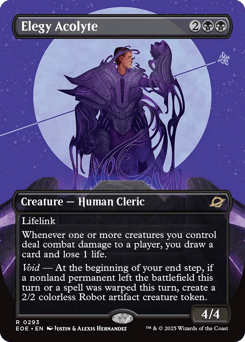 Lifelink Whenever one or more creatures you control deal combat damage to a player, you draw a card and lose 1 life. Void — At the beginning of your end step, if a nonland permanent left the battlefield this turn or a spell was warped this turn, create a 2/2 colorless Robot artifact creature token.