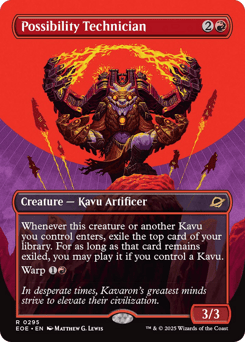 Whenever this creature or another Kavu you control enters, exile the top card of your library. For as long as that card remains exiled, you may play it if you control a Kavu. Warp {1}{R} (You may cast this card from your hand for its warp cost. Exile this creature at the beginning of the next end step, then you may cast it from exile on a later turn.)
