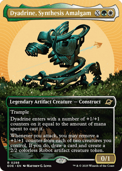 Trample Dyadrine enters with a number of +1/+1 counters on it equal to the amount of mana spent to cast it. Whenever you attack, you may remove a +1/+1 counter from each of two creatures you control. If you do, draw a card and create a 2/2 colorless Robot artifact creature token.