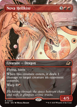 Flying, haste When this creature enters, it deals 1 damage to target creature an opponent controls. Warp {2}{R} (You may cast this card from your hand for its warp cost. Exile this creature at the beginning of the next end step, then you may cast it from exile on a later turn.)