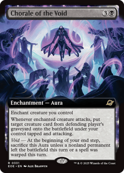Enchant creature you control Whenever enchanted creature attacks, put target creature card from defending player's graveyard onto the battlefield under your control tapped and attacking. Void — At the beginning of your end step, sacrifice this Aura unless a nonland permanent left the battlefield this turn or a spell was warped this turn.