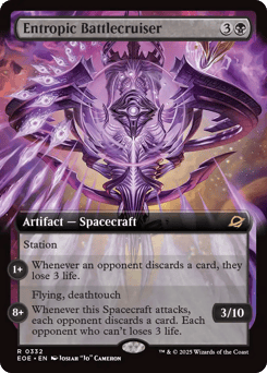 Station (Tap another creature you control: Put charge counters equal to its power on this Spacecraft. Station only as a sorcery. It's an artifact creature at 8+.) Station 1+: Whenever an opponent discards a card, they lose 3 life. Station 8+: Flying, deathtouch Whenever this Spacecraft attacks, each opponent discards a card. Each opponent who doesn't loses 3 life.