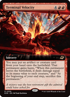 You may put an artifact or creature card from your hand onto the battlefield. That permanent gains haste, "When this permanent leaves the battlefield, it deals damage equal to its mana value to each creature," and "At the beginning of your end step, sacrifice this permanent."