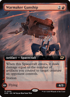 When this Spacecraft enters, it deals damage equal to the number of artifacts you control to target creature an opponent controls. Station (Tap another creature you control: Put charge counters equal to its power on this Spacecraft. Station only as a sorcery. It's an artifact creature at 6+.) Station 6+: Flying