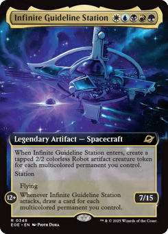 When Infinite Guideline Station enters, create a tapped 2/2 colorless Robot artifact creature token for each multicolored permanent you control. Station (Tap another creature you control: Put charge counters equal to its power on this Spacecraft. Station only as a sorcery. It's an artifact creature at 12+.) Station 12+: Flying Whenever Infinite Guideline Station attacks, draw a card for each multicolored permanent you control.