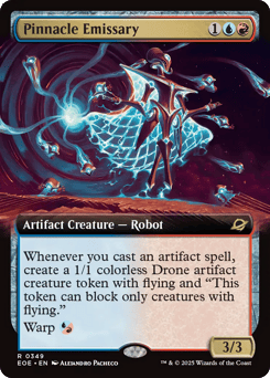 Whenever you cast an artifact spell, create a 1/1 colorless Drone artifact creature token with flying and "This token can block only creatures with flying." Warp {U/R} (You may cast this card from your hand for its warp cost. Exile this creature at the beginning of the next end step, then you may cast it from exile on a later turn.)