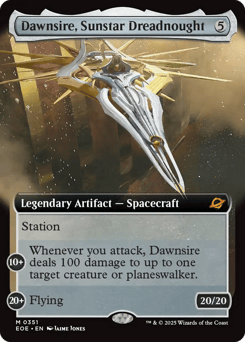 Station (Tap another creature you control: Put charge counters equal to its power on this Spacecraft. Station only as a sorcery. It's an artifact creature at 20+.) Station 10+: Whenever you attack, Dawnsire deals 100 damage to up to one target creature or planeswalker. Station 20+: Flying