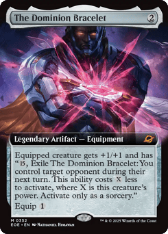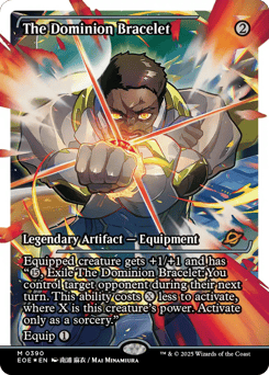 Equipped creature gets +1/+1 and has "{15}, Exile The Dominion Bracelet: You control target opponent during their next turn. This ability costs {X} less to activate, where X is this creature's power. Activate only as a sorcery." (You see all cards that player could see and make all decisions for them.) Equip {1}