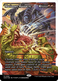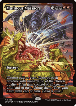 Choose odd or even. Destroy each creature with mana value of the chosen quality. Then gain control of all creatures until end of turn. Untap them. They gain haste until end of turn. (Zero is even.)