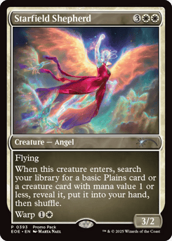 Flying When this creature enters, search your library for a basic Plains card or a creature card with mana value 1 or less, reveal it, put it into your hand, then shuffle. Warp {1}{W} (You may cast this card from your hand for its warp cost. Exile this creature at the beginning of the next end step, then you may cast it from exile on a later turn.)