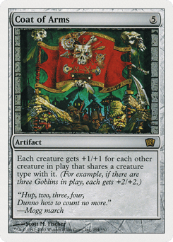 Each creature gets +1/+1 for each other creature on the battlefield that shares at least one creature type with it. (For example, if two Goblin Warriors and a Goblin Shaman are on the battlefield, each gets +2/+2.)