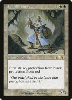 First strike, protection from black and from red (This creature deals combat damage before creatures without first strike. It can't be blocked, targeted, dealt damage, or enchanted by anything black or red.)