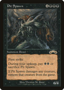 First strike At the beginning of your upkeep, sacrifice this creature unless you pay {B}{B}. Whenever this creature deals damage to a creature, exile that creature.