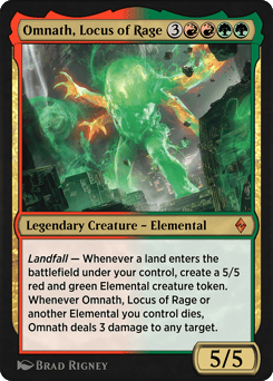 Landfall — Whenever a land you control enters, create a 5/5 red and green Elemental creature token. Whenever Omnath or another Elemental you control dies, Omnath deals 3 damage to any target.