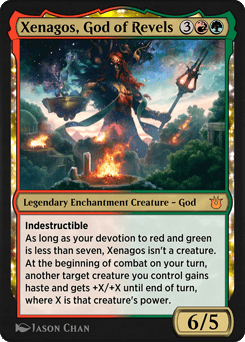 Indestructible As long as your devotion to red and green is less than seven, Xenagos isn't a creature. At the beginning of combat on your turn, another target creature you control gains haste and gets +X/+X until end of turn, where X is that creature's power.