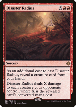 As an additional cost to cast this spell, reveal a creature card from your hand. Disaster Radius deals X damage to each creature your opponents control, where X is the revealed card's mana value.