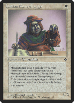 This creature enters with three credit counters on it. When this creature enters, it deals 3 damage to you. At the beginning of your upkeep, put a credit counter on this creature. Sacrifice this creature: You gain 1 life for each credit counter on this creature. Activate only during your upkeep.