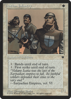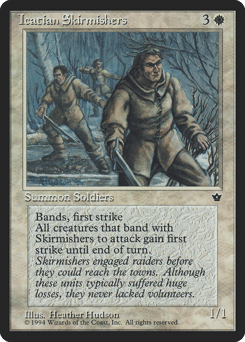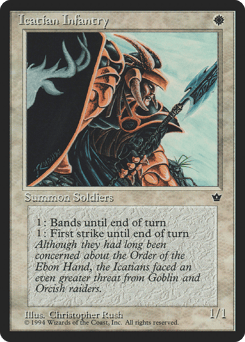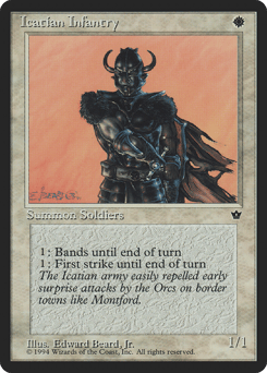 {1}: This creature gains first strike until end of turn. {1}: This creature gains banding until end of turn. (Any creatures with banding, and up to one without, can attack in a band. Bands are blocked as a group. If any creatures with banding you control are blocking or being blocked by a creature, you divide that creature's combat damage, not its controller, among any of the creatures it's being blocked by or is blocking.)