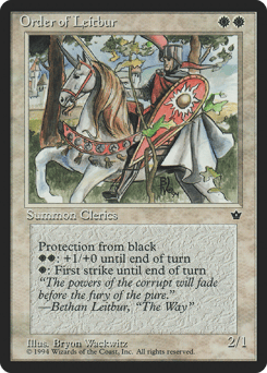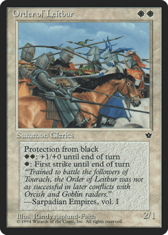Protection from black {W}: This creature gains first strike until end of turn. {W}{W}: This creature gets +1/+0 until end of turn.