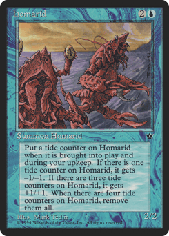 This creature enters with a tide counter on it. At the beginning of your upkeep, put a tide counter on this creature. As long as there is exactly one tide counter on this creature, it gets -1/-1. As long as there are exactly three tide counters on this creature, it gets +1/+1. Whenever there are four or more tide counters on this creature, remove all tide counters from it.
