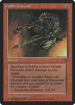 As an additional cost to cast this spell, sacrifice a Goblin. Goblin Grenade deals 5 damage to any target.