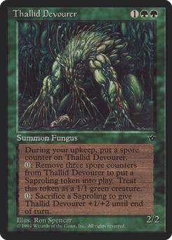 At the beginning of your upkeep, put a spore counter on this creature. Remove three spore counters from this creature: Create a 1/1 green Saproling creature token.