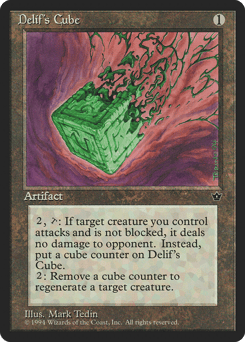 {2}, {T}: This turn, when target creature you control attacks and isn't blocked, it assigns no combat damage this turn and you put a cube counter on this artifact. {2}, Remove a cube counter from this artifact: Regenerate target creature.