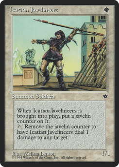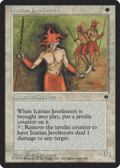 This creature enters with a javelin counter on it. {T}, Remove a javelin counter from this creature: It deals 1 damage to any target.