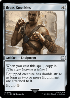 When you cast this spell, copy it. (The copy becomes a token.) Equipped creature has double strike as long as two or more Equipment are attached to it. Equip {1} ({1}: Attach to target creature you control. Equip only as a sorcery.)