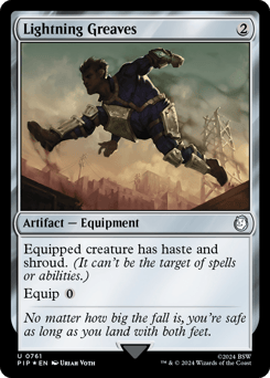 Equipped creature has hexproof and haste. (It can't be the target of spells or abilities your opponents control. It can attack and {T} no matter when it came under your control.) Equip {1} ({1}: Attach to target creature you control. Equip only as a sorcery.)