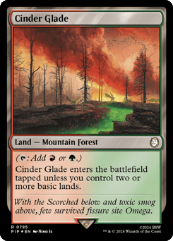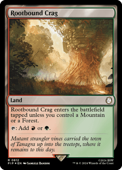 This land enters tapped unless you control a Mountain or a Forest. {T}: Add {R} or {G}.