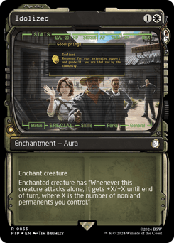 Enchant creature Enchanted creature has "Whenever this creature attacks alone, it gets +X/+X until end of turn, where X is the number of nonland permanents you control."