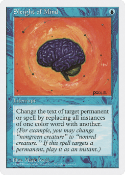 Change the text of target spell or permanent by replacing all instances of one basic land type with another. (For example, you may change "swampwalk" to "plainswalk." This effect lasts indefinitely.)