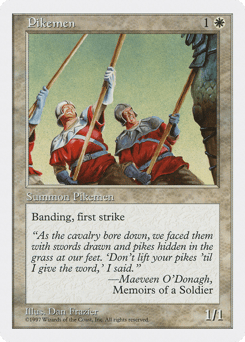 First strike; banding (Any creatures with banding, and up to one without, can attack in a band. Bands are blocked as a group. If any creatures with banding you control are blocking or being blocked by a creature, you divide that creature's combat damage, not its controller, among any of the creatures it's being blocked by or is blocking.)