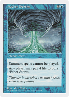 Creature spells can't be cast. Pay 4 life: Destroy Aether Storm. It can't be regenerated. Any player may activate this ability.