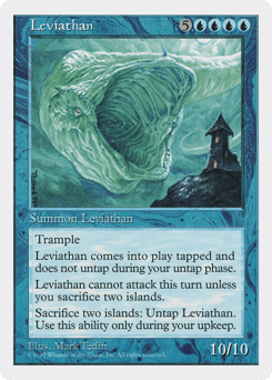 Trample This creature enters tapped and doesn't untap during your untap step. At the beginning of your upkeep, you may sacrifice two Islands. If you do, untap this creature. This creature can't attack unless you sacrifice two Islands. (This cost is paid as attackers are declared.)