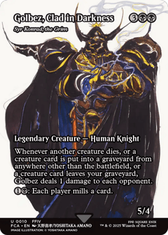 Whenever another creature dies, or a creature card is put into a graveyard from anywhere other than the battlefield, or a creature card leaves your graveyard, Syr Konrad deals 1 damage to each opponent. {1}{B}: Each player mills a card. (They each put the top card of their library into their graveyard.)