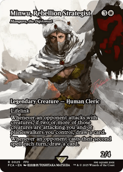 Lifelink Whenever an opponent attacks with creatures, if two or more of those creatures are attacking you and/or planeswalkers you control, draw a card. Whenever an opponent casts their second spell each turn, draw a card.