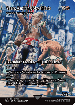 Haste Whenever Captain Lannery Storm attacks, create a Treasure token. (It's an artifact with "{T}, Sacrifice this token: Add one mana of any color.") Whenever you sacrifice a Treasure, Captain Lannery Storm gets +1/+0 until end of turn.