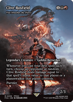 Whenever you cast your first spell each turn, choose an opponent at random. Vial Smasher deals damage equal to that spell's mana value to that player or a planeswalker that player controls. Partner (You can have two commanders if both have partner.)