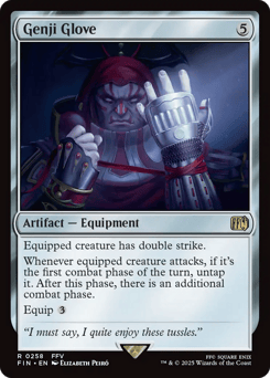 Equipped creature has double strike. Whenever equipped creature attacks, if it's the first combat phase of the turn, untap it. After this phase, there is an additional combat phase. Equip {3}