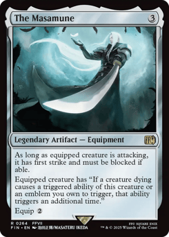 As long as equipped creature is attacking, it has first strike and must be blocked if able. Equipped creature has "If a creature dying causes a triggered ability of this creature or an emblem you own to trigger, that ability triggers an additional time." Equip {2}