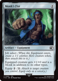 Job select (When this Equipment enters, create a 1/1 colorless Hero creature token, then attach this to it.) Equipped creature gets +1/+0 and is a Monk in addition to its other types. Equip {2} ({2}: Attach to target creature you control. Equip only as a sorcery.)