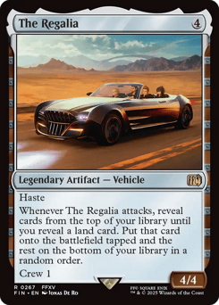 Haste Whenever The Regalia attacks, reveal cards from the top of your library until you reveal a land card. Put that card onto the battlefield tapped and the rest on the bottom of your library in a random order. Crew 1