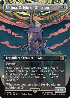 Flying Whenever Ultima attacks, put a blight counter on target land. For as long as that land has a blight counter on it, it loses all land types and abilities and has "{T}: Add {C}." Whenever you tap a land for {C}, add an additional {C}.