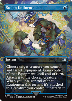Choose target creature you control and target Equipment. Gain control of that Equipment until end of turn. Attach it to the chosen creature. When you lose control of that Equipment this turn, if it's attached to a creature you control, unattach it.