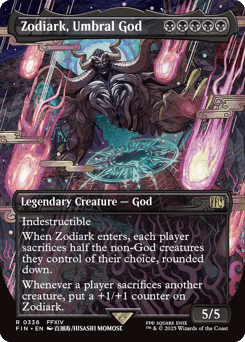 Indestructible When Zodiark enters, each player sacrifices half the non-God creatures they control of their choice, rounded down. Whenever a player sacrifices another creature, put a +1/+1 counter on Zodiark.
