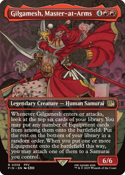 Whenever Gilgamesh enters or attacks, look at the top six cards of your library. You may put any number of Equipment cards from among them onto the battlefield. Put the rest on the bottom of your library in a random order. When you put one or more Equipment onto the battlefield this way, you may attach one of them to a Samurai you control.